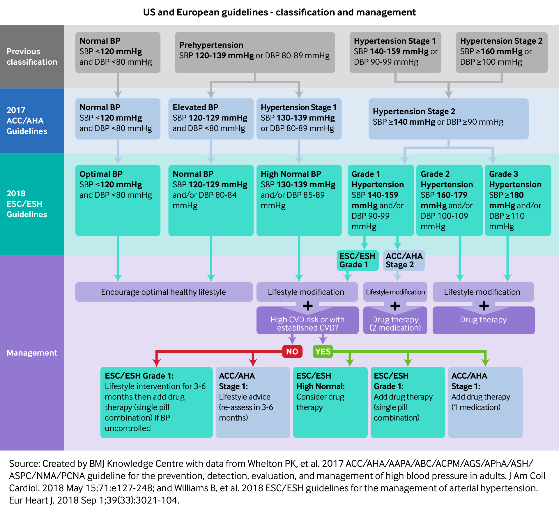 The American College of Cardiology (ACC)/American Heart Association (AHA) guideline recommends a blood pressure (BP) target of <130/80 mmHg for adults, regardless of age, with confirmed hypertension and known cardiovascular disease (CVD), or a 10-year atherosclerotic CVD risk (using the atherosclerotic CVD [ASCVD] risk estimator) of 10% or more.[2]Whelton PK, Carey RM, Aronow WS, et al. 2017 ACC/AHA/AAPA/ABC/ACPM/AGS/APhA/ASH/ASPC/NMA/PCNA guideline for the prevention, detection, evaluation, and management of high blood pressure in adults: a report of the American College of Cardiology/American Heart Association Task Force on Clinical Practice Guidelines. J Am Coll Cardiol. 2018 May 15;71(19):e127-248.